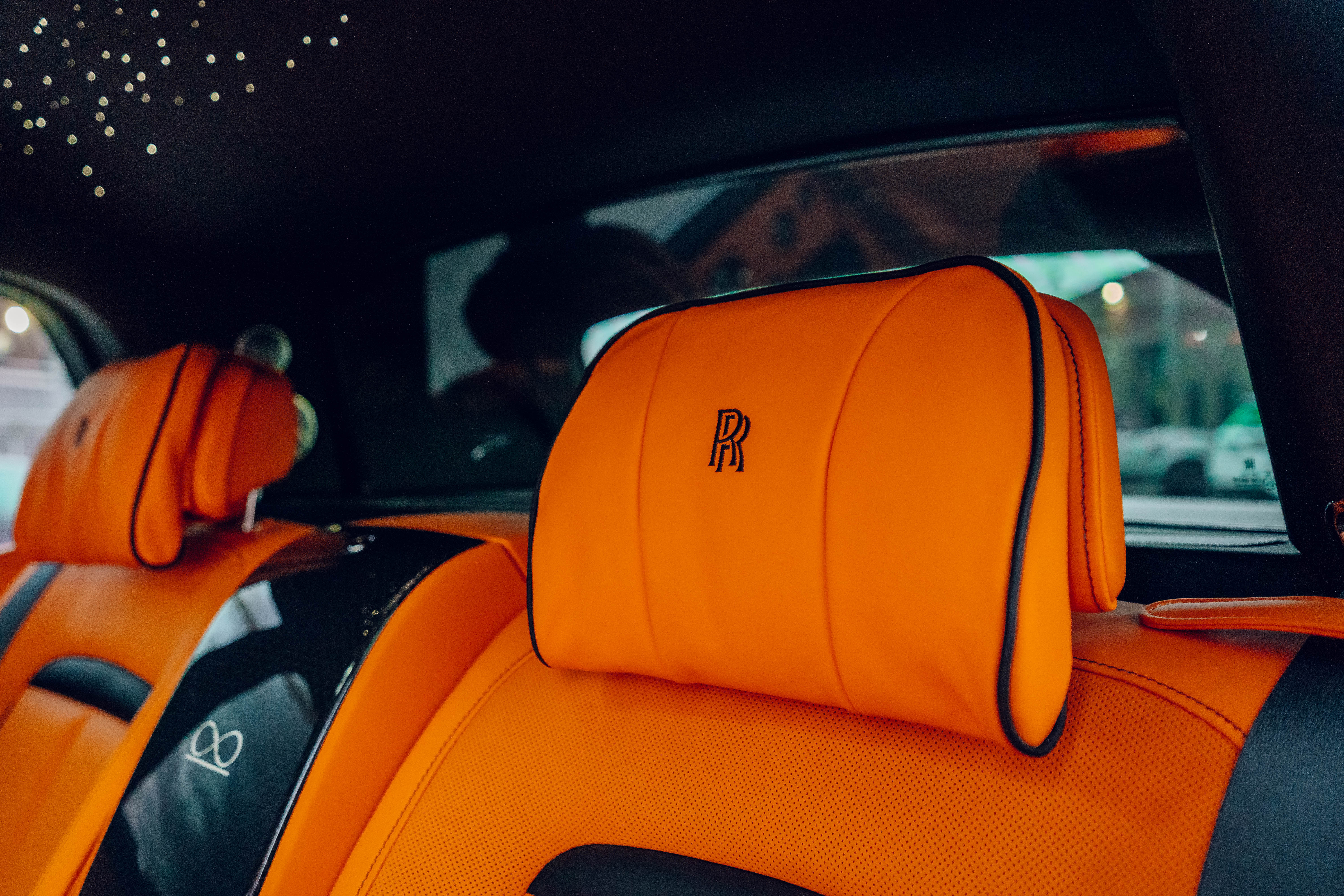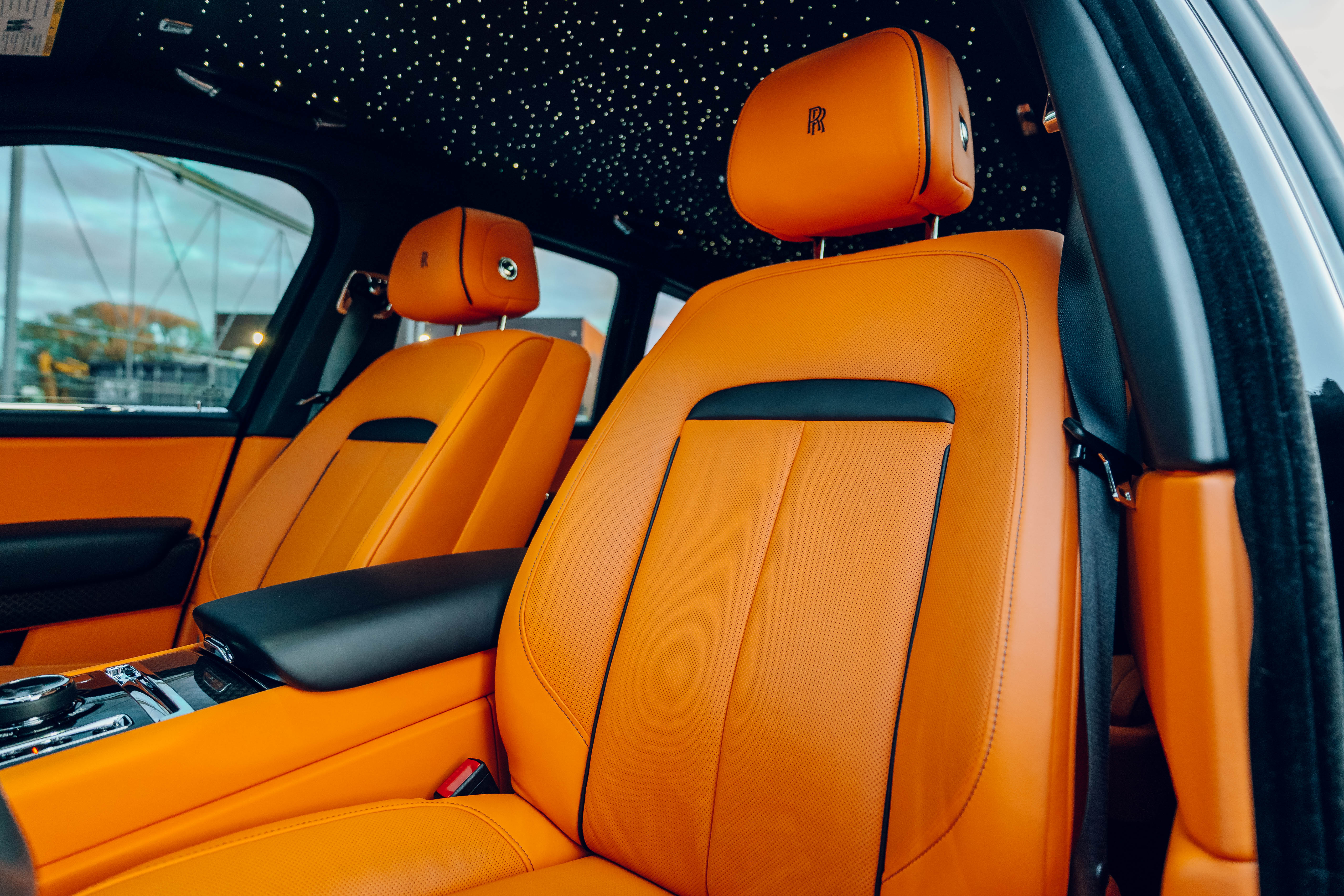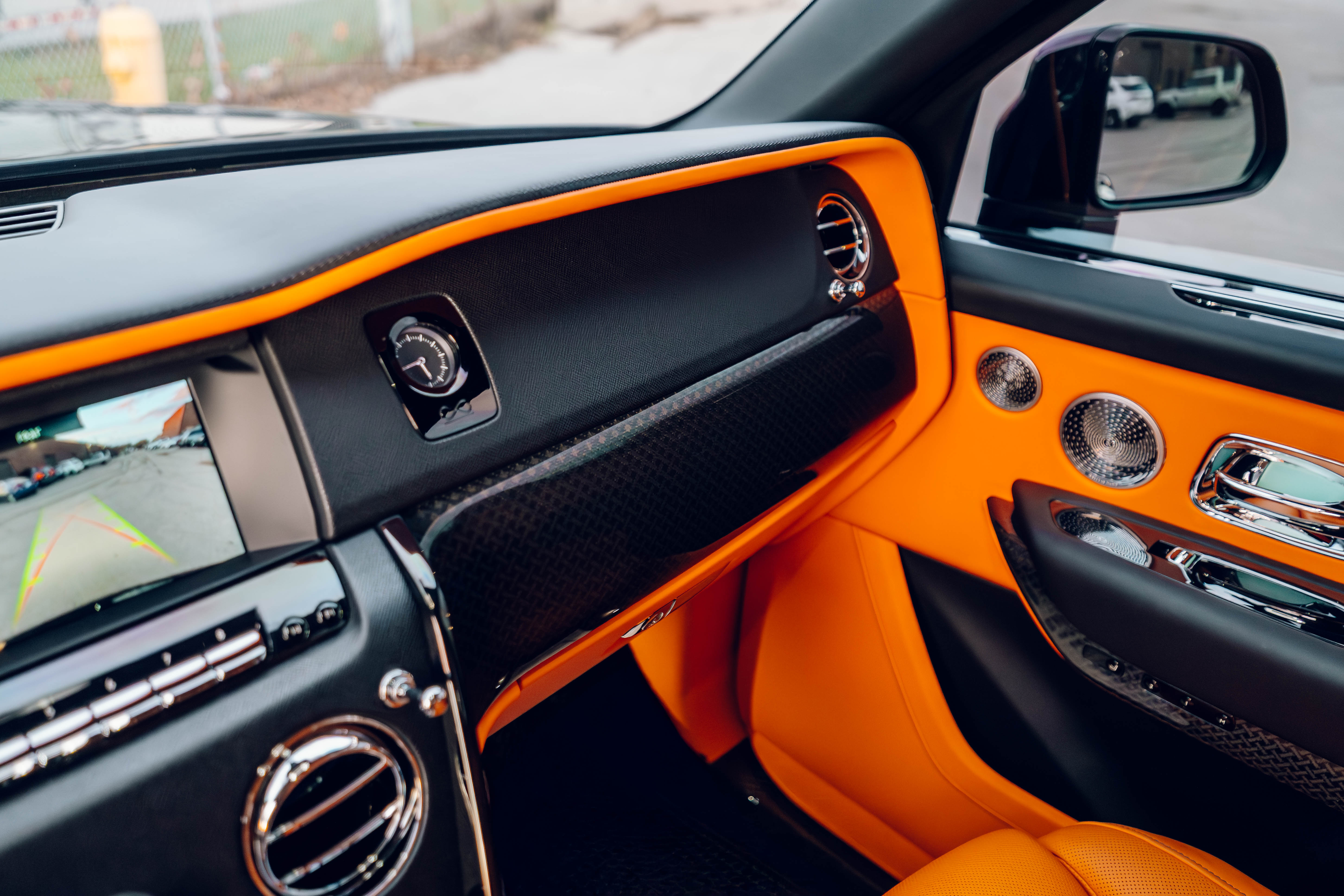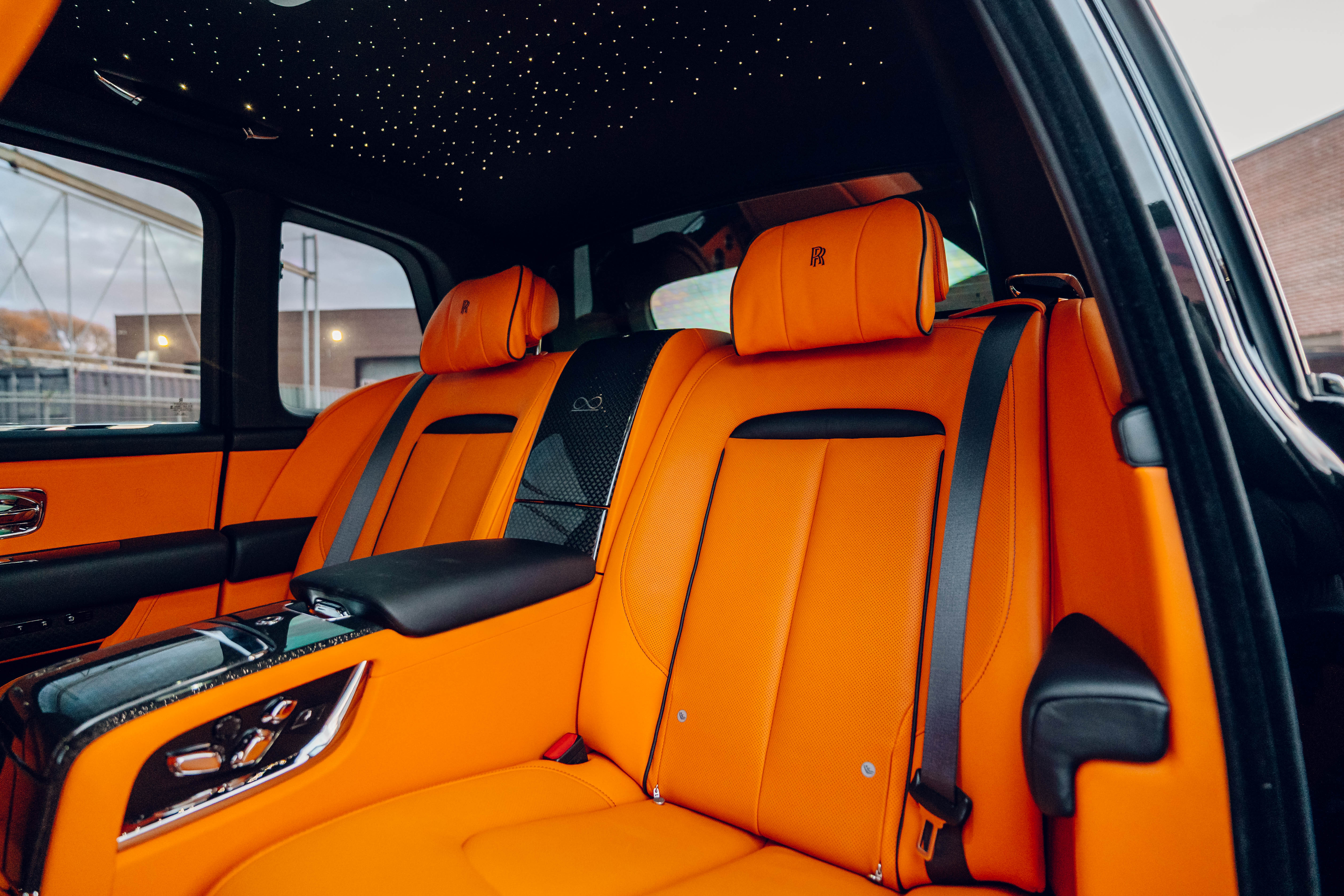 2023 Rolls Royce Cullinan Black Badge | Clean CARFAX | Star light head liner | Hand painted coach line in Tangerine Orange | Extended Tangerine Orange interior | Captain seat configuration | Rear glass partition |